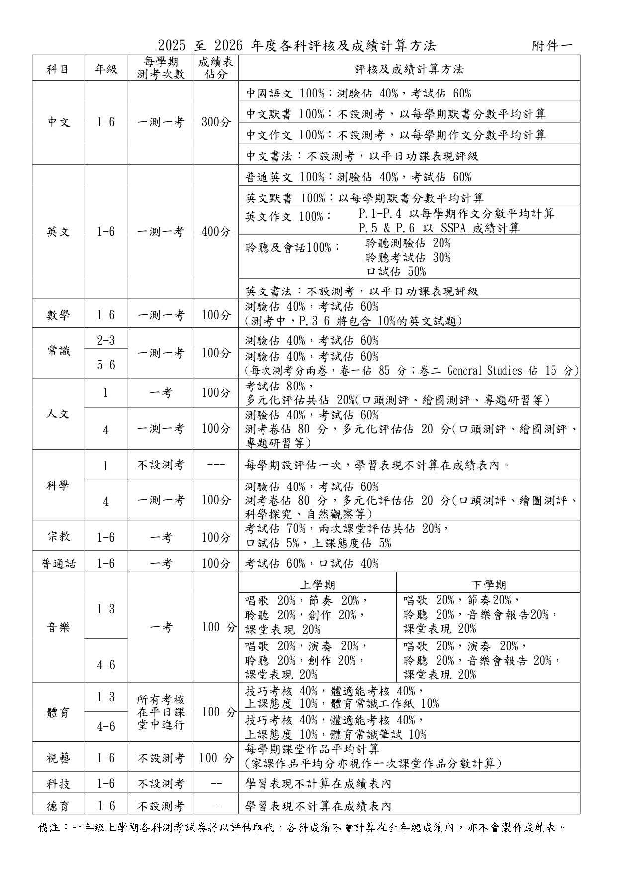 各科評核及成績計算方法